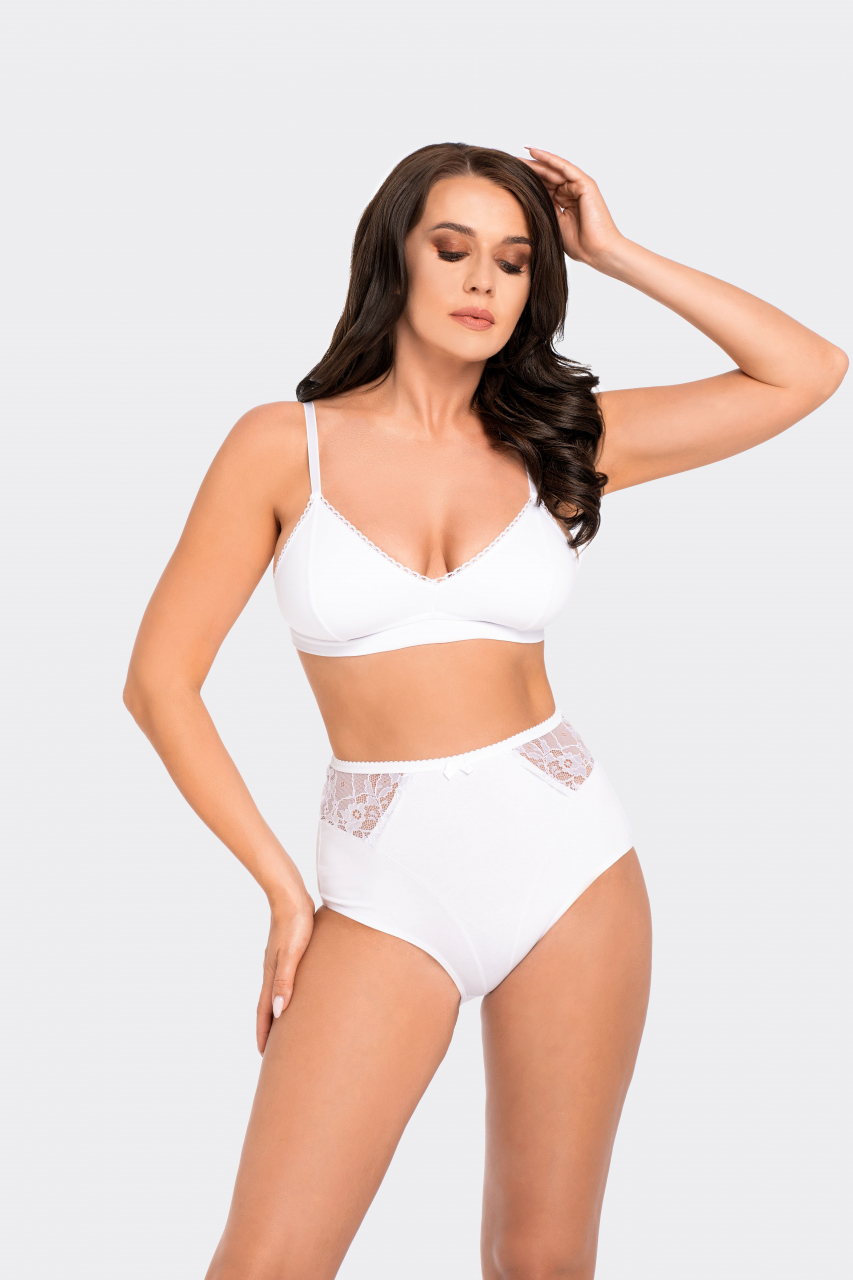 Bawełniane figi, wyższe w kroju. Model o profilujących cięciach, z koronkową wstawką po obu bokach. W pasie wygodna, elastyczna gumka. Skład: 92% bawełna, 8% elastan.