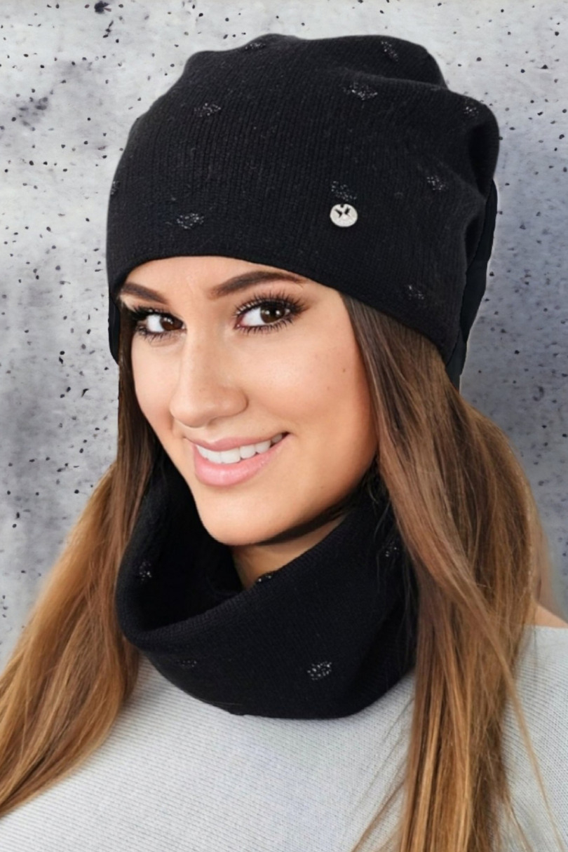 Czapka o ponadczasowym kształcie, ozdobiona wypukłymi groszkami wykonanymi z połyskującej przędzy. Wykonana z wysokiej jakości przędzy, z dużą zawartością wiskozy. Niezwykle miękka i przyjemna w dotyku, będzie idealnym dopełnieniem jesienno-zimowych stylizacji.