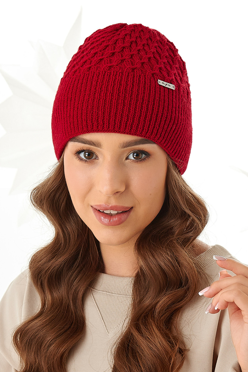 Czapka damska z podwójnej warstwy ciepłej, miłej w dotyku włóczki, ozdobiona wzorzystym ściegiem i małą, srebrną blaszką z firmowym logo.