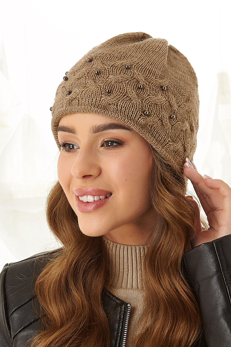 Czapka damska z podwójnej warstwy ciepłej, miłej w dotyku włóczki, ozdobiona wzorzystym ściegiem i perełkami.