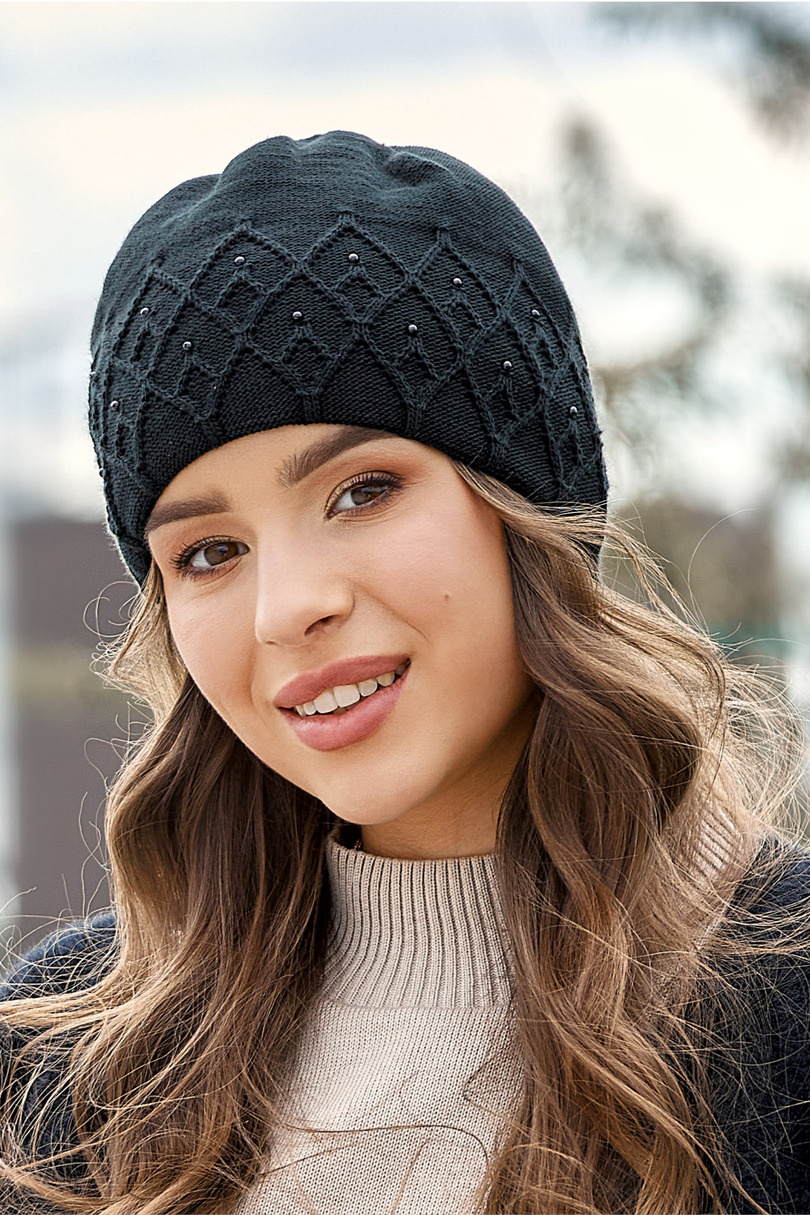 Czapka klasyczna z ciekawym wzorkiem i srebrnymi dżetami. Ciepła, uszyta z dwóch warstw dzianiny, miękka i przyjemna w dotyku.