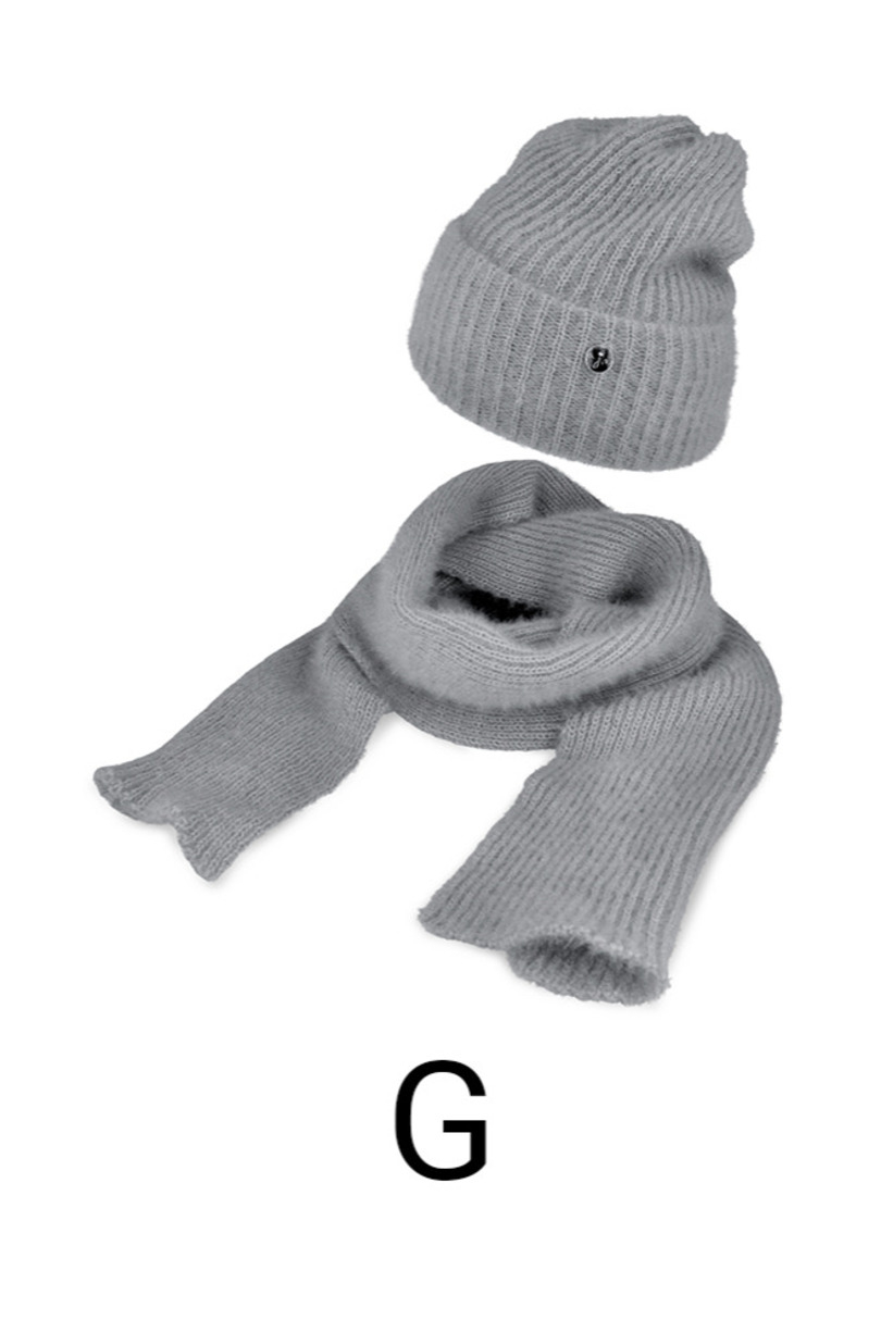 Ciepły komplet damski składający się z czapki i szalika wykonany z ciepłej, połyskującej włóczki. Czapka z wywinięciem ozdobiona blaszką z firmowym logo, klasyczny długi szalik o wymiarach 194 cm x 23 cm.