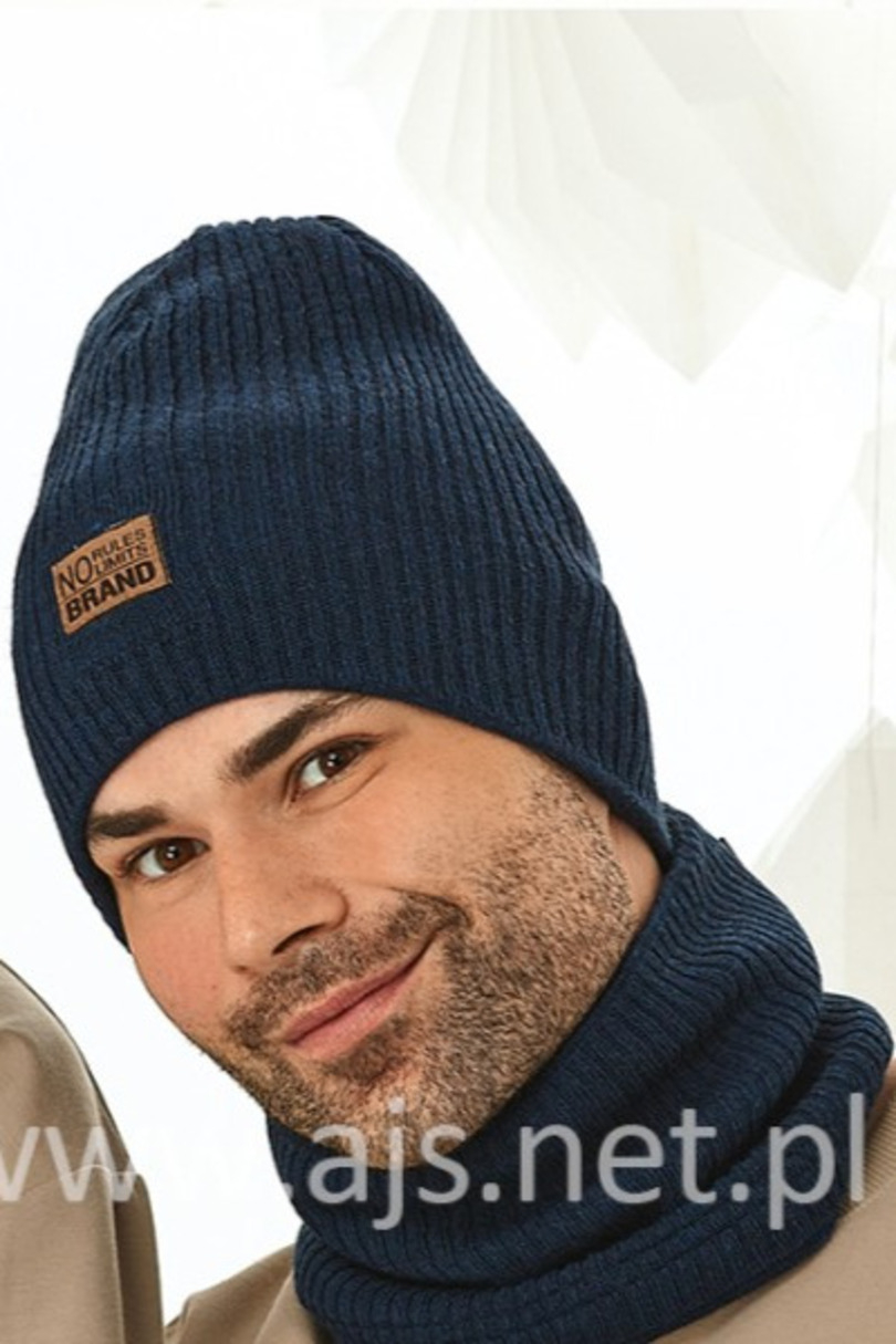 Komplet męski: czapka + komin. Komin dosyć długi, co pozwala wywinąć go jak golf. Czapka z podwójnej ale nie zbyt grubej warsty.