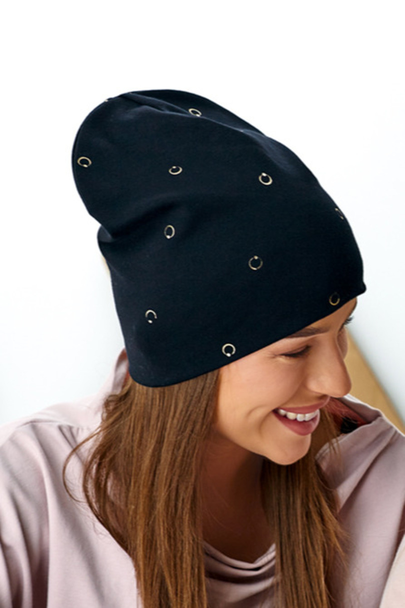 Czapka damska z podwójnej, cienkiej bawełny, z delikatym złotym wzorkiem.