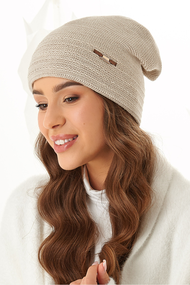 Czapka damska z podwójnej warstwy ciepłej, miłej w dotyku włóczki, ozdobiona delikatnym wzorzystym ściegiem i małą, błyszczącą ozdobą z cyrkoniami. Model wydłużony, tyły podszyty w ozdobną zakładkę, dzięki czemu czapka bardzo ładnie sie układa.