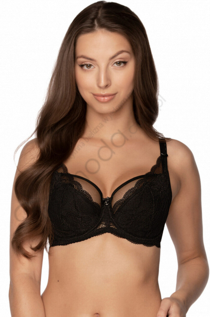 Dolna część misek wykonana z cienkiej pianki gorseciarskiej powleczonej koronką, a górna z koronki i tiulu, dzięki czemu biustonosz doskonale dopasowuje się do kształtu piersi, Tył biustonosza efektownie ozdobiony koronką, Świetnie sprawdzi się przy asymetrii piersi, Dolną część misek pokryto od wewnątrz bawełną ze standardem OEKO-TEX® przyjazną dla skóry, Pionowe fiszbiny boczne stabilizują obwód biustonosza, Biustonosz zaprojektowano i uszyto w Polsce, W celu utrzymania bielizny w dobrej kondycji przez długi czas zaleca się delikatne pranie ręczne w temperaturze 30°C, Modelka Gabriela ma 174 cm wzrostu i nosi rozmiar 70E.