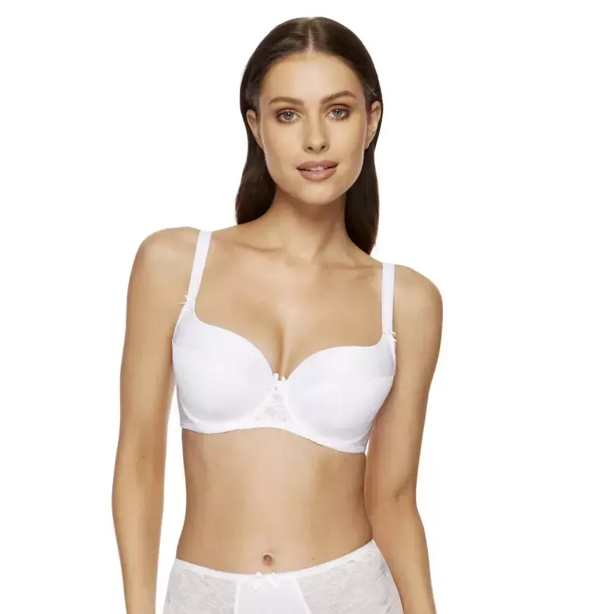 Miski usztywniane, wykonane z pianki gorseciarskiej powleczonej materiałem w połyskujący wzór roślinny, Wewnętrzną część misek pokryto bawełną ze standardem OEKO-TEX®, dzięki czemu są przyjazne dla skóry, Pionowe fiszbiny boczne stabilizują obwód biustonosza, Biustonosz zaprojektowano i uszyto w Polsce, W celu utrzymania bielizny w dobrej kondycji przez długi czas zaleca się delikatne pranie ręczne w temperaturze 30°C, Modelka Gabriela ma 174 cm wzrostu i nosi rozmiar 70E.