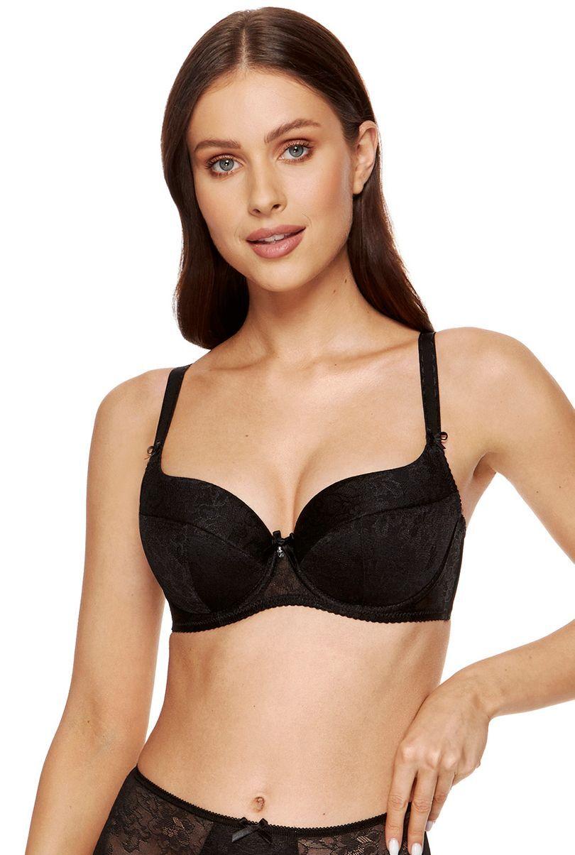 Miski usztywniane, wykonane z pianki gorseciarskiej powleczonej materiałem w połyskujący wzór roślinny, Wewnętrzną część misek pokryto bawełną ze standardem OEKO-TEX®, dzięki czemu są przyjazne dla skóry, Pionowe fiszbiny boczne stabilizują obwód biustonosza, Biustonosz zaprojektowano i uszyto w Polsce, W celu utrzymania bielizny w dobrej kondycji przez długi czas zaleca się delikatne pranie ręczne w temperaturze 30°C, Modelka Gabriela ma 174 cm wzrostu i nosi rozmiar 70E.