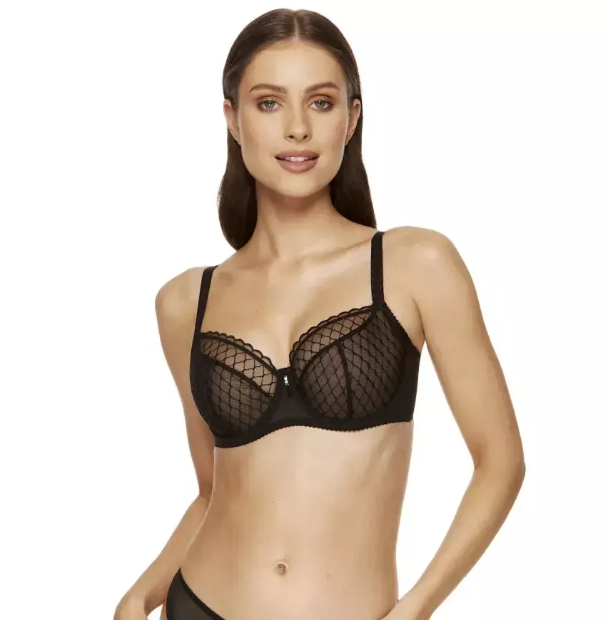 Miękkie, półprzeźroczyste miseczki z haftu w kratkę na fiszbinach, Plecy wykonane z tiulu elastycznego oraz haftu, Regulowane, nieodpinane ramiączka, Pionowe fiszbiny boczne zapobiegające marszczeniu się boczków, Biustonosz zaprojektowano i uszyto w Polsce, W celu utrzymania bielizny w dobrej kondycji przez długi czas zaleca się delikatne pranie ręczne w temperaturze 30°C, Modelka Dominika ma 180 cm wzrostu i nosi rozmiar 85H. Modelka Gabriela ma 174 cm wzrostu i nosi rozmiar 70E, Ważne! Rozmiarówka w modelu jest zaniżona. Przy średnich i dużych rozmiarach zalecamy wybrać miskę o jeden rozmiar większą.