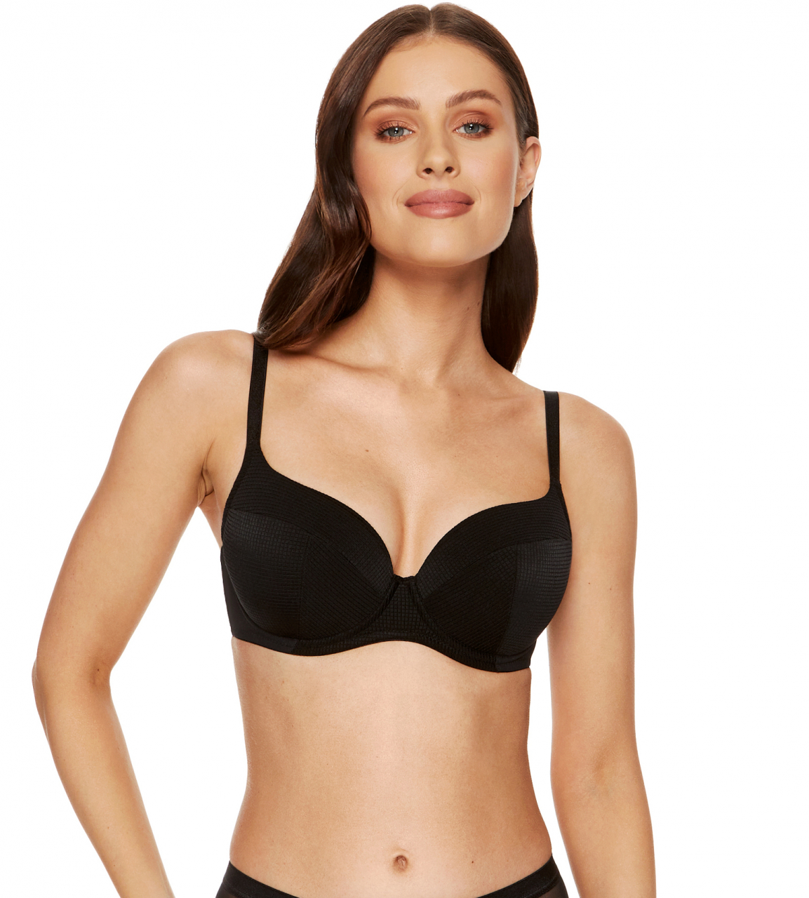 Trzyczęściowe miski z cienkiej pianki gorseciarskiej powleczonej od zewnątrz tłoczoną tkaniną w kratkę, Wewnętrzną część misek pokryto bawełną ze standardem OEKO-TEX®, dzięki czemu są przyjazne dla skóry, Pionowe fiszbiny boczne stabilizują obwód biustonosza, Tył biustonosza wykonano z tiulu, Biustonosz zaprojektowano i uszyto w Polsce, W celu utrzymania bielizny w dobrej kondycji przez długi czas zaleca się delikatne pranie ręczne w temperaturze 30°C, Modelka Dominika ma 180 cm wzrostu i nosi rozmiar 85H. Modelka Gabriela ma 174 cm wzrostu i nosi rozmiar 70E.