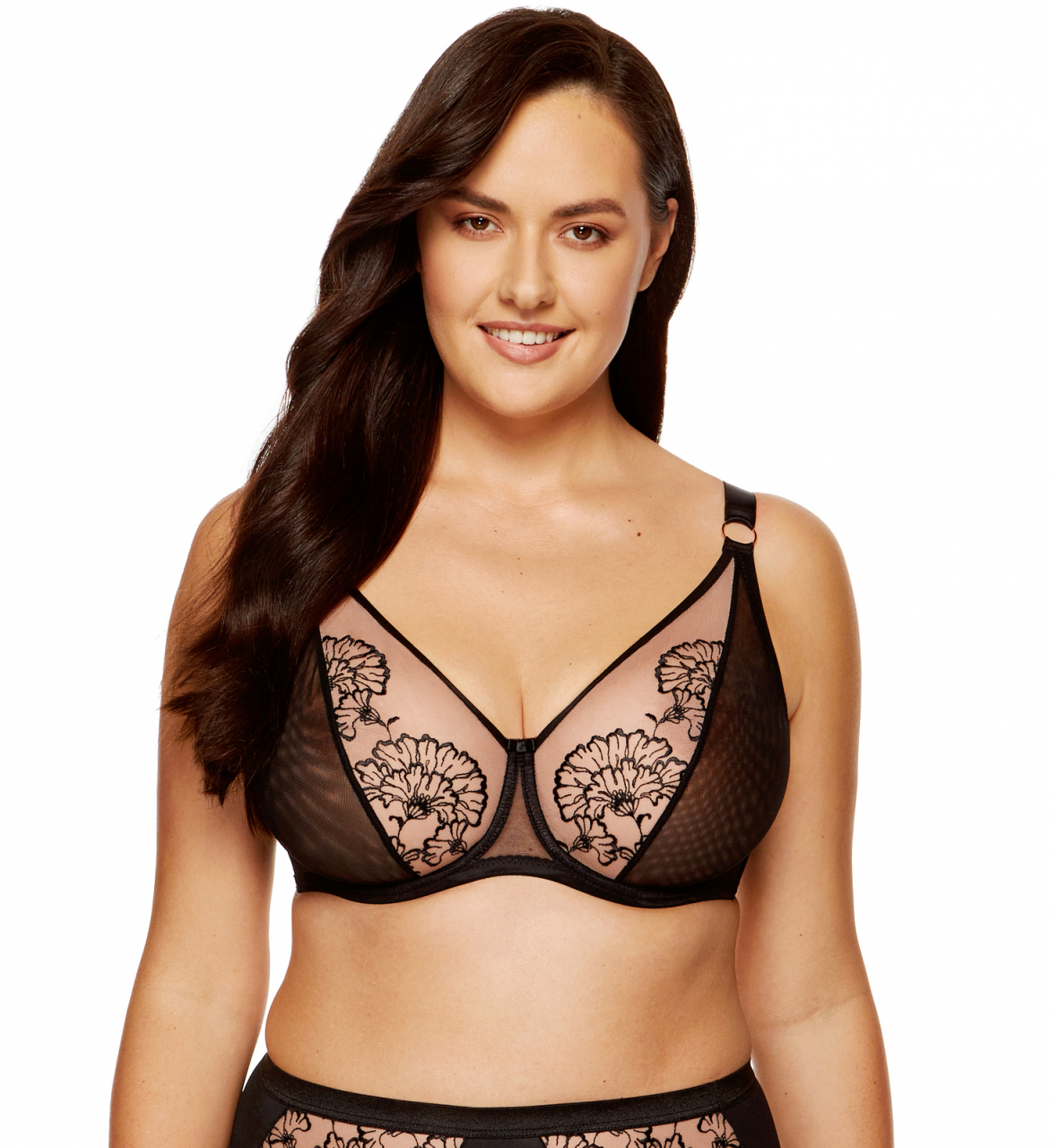 Prześwitujące, wyciągnięte ku górze, miękkie miseczki z podwójnej siateczki i haftu, Plecy wykonane ze wzmocnionego tiulu elastycznego, Złote detale dodają szczypty elegancji, Pionowe fiszbiny boczne stabilizują obwód biustonosza, Biustonosz zaprojektowano i uszyto w Polsce, W celu utrzymania bielizny w dobrej kondycji przez długi czas zaleca się delikatne pranie ręczne w temperaturze 30°C, Modelka Dominika ma 180 cm wzrostu i nosi rozmiar 85H. Modelka Gabriela ma 174 cm wzrostu i nosi rozmiar 70E.