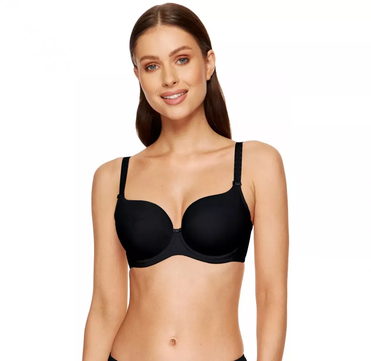 Klasyczny biustonosz w uniwersalnym kolorze stanowiącym idealne uzupełnienie każdej bieliźniarki, Miski usztywniane, wykonane z pianki gorseciarskiej obszytej gładką dzianiną, Miseczka szyta, trzyczęściowa, posiada gładki pionowy i poziomy szew po zewnętrznej stronie, Wewnętrzną część misek pokryto bawełną ze standardem OEKO-TEX®, dzięki czemu są przyjazne dla skóry, Pionowe fiszbiny boczne stabilizują obwód biustonosza, Biustonosz ozdobiony małymi kokardkami umieszczonymi między miskami oraz na ramiączkach, Biustonosz zaprojektowano i uszyto w Polsce, W celu utrzymania bielizny w dobrej kondycji przez długi czas zaleca się delikatne pranie ręczne w temperaturze 30°, Modelka Dominika ma 180 cm wzrostu i nosi rozmiar 85H. Modelka Gabriela ma 174 cm wzrostu i nosi rozmiar 70E.