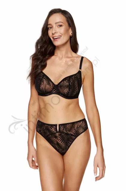 Elegancki, miękki materiał z flokowanym wzorem palemek, Dwuczęściowe, miękkie miseczki na fiszbinach, Miski częściowo prześwitujące, Biustonosz zaprojektowano i uszyto w Polsce, Złote detale dodają biustonoszowi elegancji, W celu utrzymania bielizny w dobrej kondycji przez długi czas zaleca się delikatne pranie ręczne w temperaturze 30°C, Modelka ma 180 cm wzrostu i nosi rozmiar 70E.