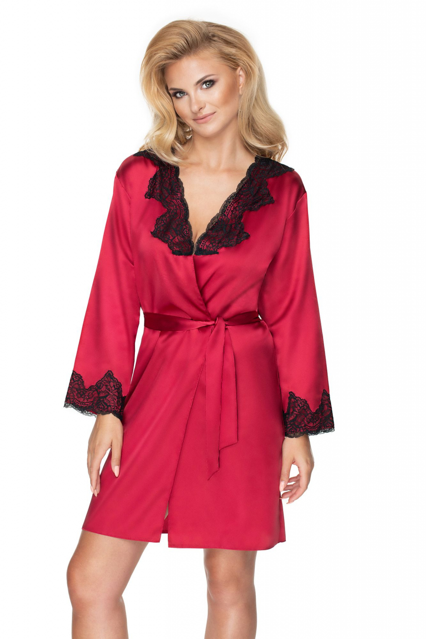 Zjawiskowy szlafrok w burgundowym (świątecznym) kolorze. Dopełniony wstawkami z czarnej, ażurowej koronki. Piękny i kobiecy! Koronka podkreśla linię dekoltu oraz zdobi rękawy przy nadgarstkach. Oto wyjątkowy, luksusowy projekt, doskonały, kobiecy fason, najwyższa jakość. Skład: 97% poliester, 3% poliamid.