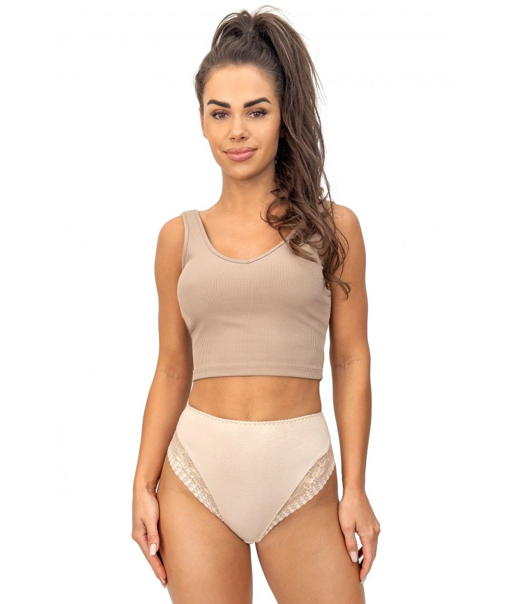 Beżowe majteczki marki Donna to elegancki i komfortowy model, który łączy klasyczny krój z delikatnym, kobiecym wykończeniem. Mają wyższy stan i zabudowane boki, dzięki czemu doskonale dopasowują się do sylwetki, zapewniając wygodę i subtelne modelowanie linii ciała. Koronkowe zdobienia nadają im romantycznego charakteru, a bawełniana wkładka wewnątrz dba o higienę i komfort noszenia. Model dostępny jest w różnych kolorach i wzorach, a każda para pakowana jest w estetyczny woreczek foliowy.