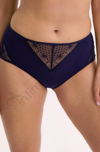 Model wykonano z nierozciągliwego tiulu, który w połączeniu z koronką o geometrycznym wzorze nadaje całości niepowtarzalnego charakteru. Dodatkowa granatowa lamówka subtelnie podkreślają dekolt, a dekoracyjna zawieszka w centrum nadaje całości luksusowego wyglądu. Gładki tył i trójstopniowe zapięcie dbają o idealne dopasowanie do sylwetki. Klasyczna, podwyższona konstrukcja na fiszbinach doskonale modeluje i stabilnie podtrzymuje biust, szczególnie większy, gwarantując wyjątkowe dopasowanie i pełen komfort przez cały dzień.