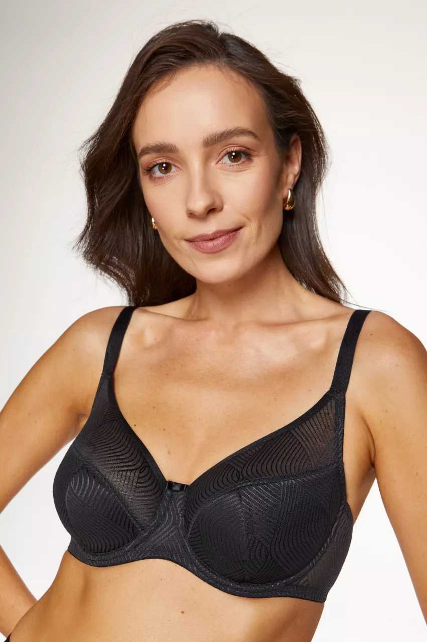 Dolna część misek wykonana z cienkiej pianki gorseciarskiej obszytej plenem, a górna z samego plenu, dzięki czemu biustonosz doskonale dopasowuje się do kształtu piersi, Niweluje widoczność asymetrii piersi, Dolną część misek pokryto od wewnątrz bawełną ze standardem OEKO-TEX®, dzięki czemu są przyjazne dla skóry, Ozdobna kokardka umieszczona między miseczkami, Biustonosz zaprojektowano i uszyto w Polsce, W celu utrzymania bielizny w dobrej kondycji przez długi czas zaleca się delikatne pranie ręczne w temperaturze 30°C, Modelka ma 180 cm wzrostu i nosi rozmiar 70E.