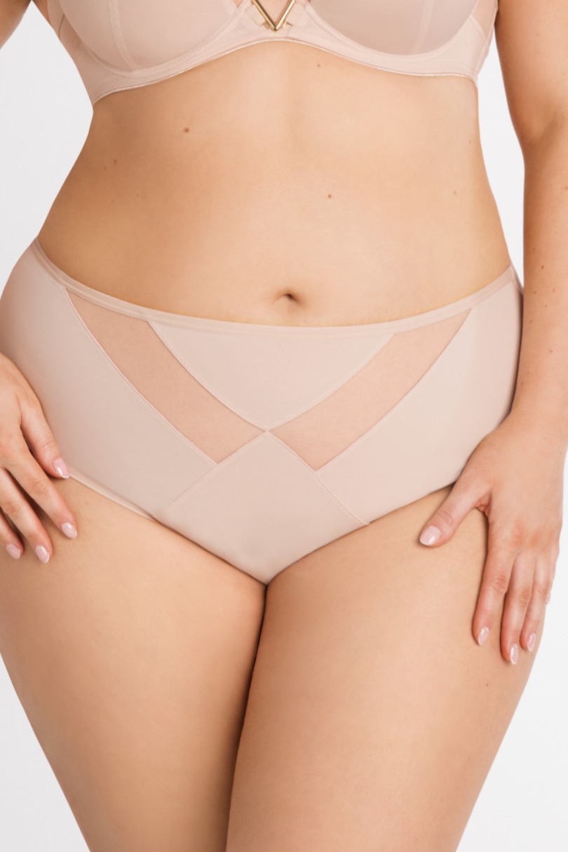 Te figi w odcieniu nude/beż to idealna propozycja dla kobiet, które lubią połączenie wygody z subtelną elegancją. Wysoki stan pięknie otula talię i podkreśla kształty, a jednocześnie delikatnie wygładza okolice brzucha. Gładka, miękka mikrofibra sprawia, że majtki świetnie leżą i są niemal niewyczuwalne na ciele. Nowoczesny charakter modelu podkreślają transparentne, tiulowe wstawki po bokach oraz z przodu, które optycznie wysmuklają sylwetkę i dodają lekkości. Bez względu na to, czy wybierasz je na co dzień, czy jako komplet z biustonoszem, zapewnią Ci komfort przez cały dzień i pewność siebie w każdej stylizacji. 90% Poliamid, 7% Elastan, 3% Poliester