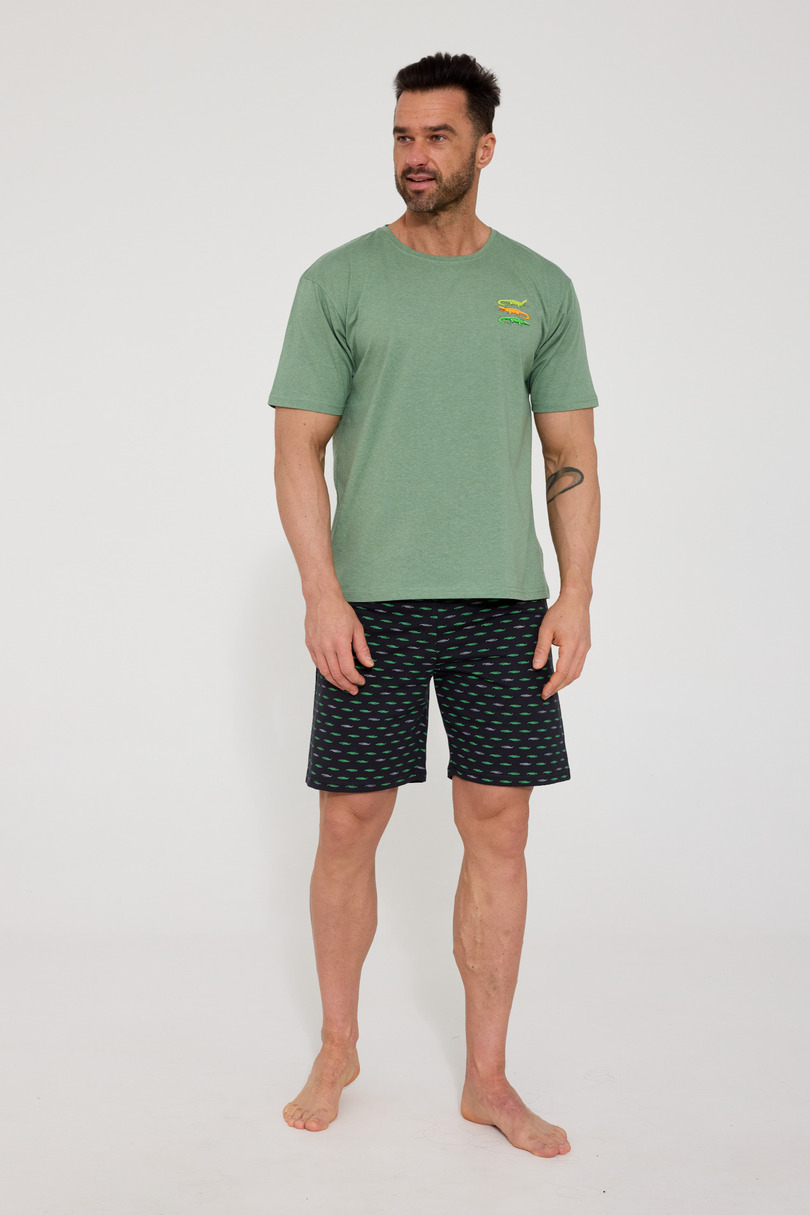 Piżama męska KR 326/202 CROCODILES 2 to wygodna i stylowa propozycja dla mężczyzn, którzy cenią komfort snu oraz luźny, młodzieżowy design. Góra kompletu w formie koszulki z krótkim rękawem została wykonana z miękkiej i przyjemnej w dotyku dzianiny bawełnianej z dodatkiem poliestru, co zwiększa jej trwałość i odporność na częste pranie. Półokrągły dekolt zapewnia swobodę noszenia, a mały, kolorowy nadruk z krokodylami na piersi dodaje piżamie oryginalnego charakteru.