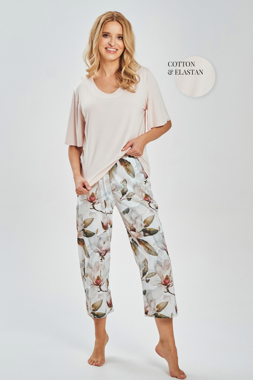 Piżama damska 3535 AFRODYTA to elegancka i wyjątkowo komfortowa propozycja dla kobiet, które cenią połączenie kobiecego stylu z wygodą noszenia. Koszulka w jednolitym kolorze została wykonana z miękkiej bawełny z dodatkiem elastanu, dzięki czemu doskonale dopasowuje się do sylwetki i zapewnia swobodę ruchów. Rękawy do łokcia, delikatnie falowane, nadają całości lekkości i subtelnej elegancji, a większy dekolt pięknie podkreśla linię szyi. Spodnie o długości 7/8 zdobi efektowny print w kolorowe kwiaty, który dodaje piżamie świeżości i romantycznego charakteru. W pasie zastosowano wygodną gumkę obszytą bawełną, gwarantującą idealne dopasowanie bez ucisku. Piżama AFRODYTA sprawdzi się doskonale zarówno do snu, jak i do domowego relaksu, a także jako stylowy i praktyczny prezent.