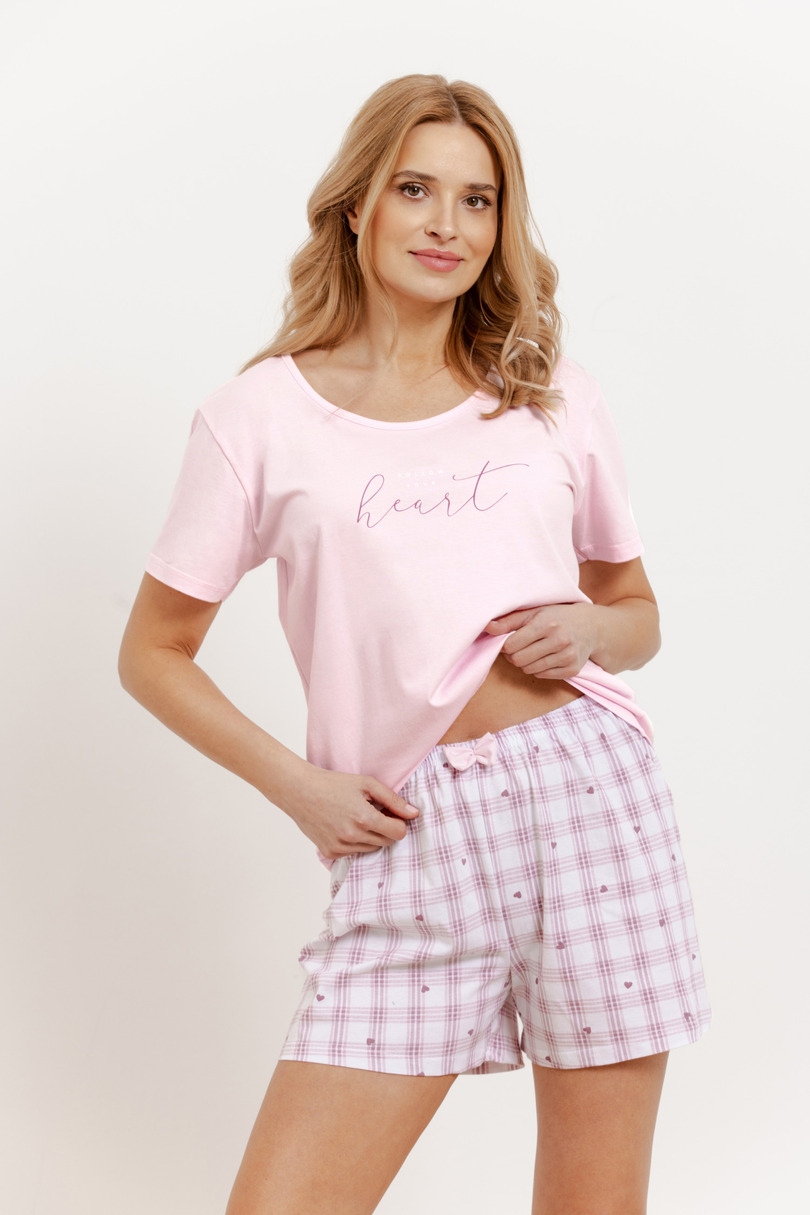 Damska piżama Arabella 3416 marki Taro to wyjątkowa propozycja na letnie noce. Wykonana w 100% z wysokogatunkowej bawełny, gwarantuje lekkość, przewiewność i maksymalny komfort podczas snu. Piżama składa się z gładkiej koszulki z krótkim rękawem i półokrągłym dekoltem, który dodaje jej subtelnej elegancji. Do kompletu dołączone są krótkie, wzorzyste spodenki, które przyciągają uwagę modnym wzorem oraz uroczą kokardką w pasie. Ten zestaw to idealne połączenie kobiecego stylu i wygody – idealny na ciepłe noce! Skład: 100% Bawełna