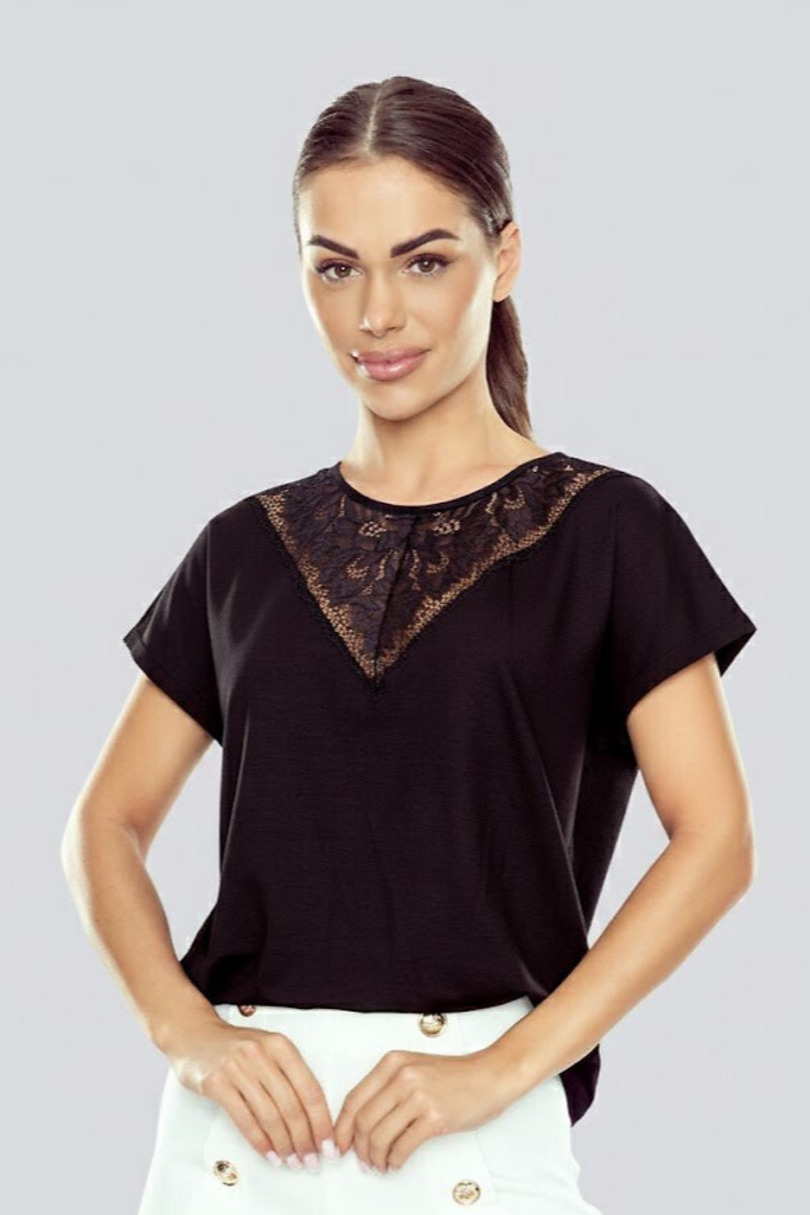 Bluzka damska Laurella z krótkim rękawem to elegancka propozycja, która łączy wygodę noszenia z kobiecym, stylowym wyglądem. Model został wykonany z wysokiej jakości miękkiej i elastycznej wiskozy, dzięki czemu doskonale układa się na sylwetce i zapewnia komfort przez cały dzień. Luźny, swobodny fason sprawia, że bluzka świetnie maskuje drobne niedoskonałości i pasuje do różnych typów sylwetek. Klasyczny okrągły dekolt został ozdobiony efektowną koronką o kwiatowym princie, która nadaje całości subtelnej elegancji i przyciąga wzrok. Krótkie rękawy czynią model Laurella idealnym wyborem zarówno do stylizacji biurowych, jak i na spotkania czy wieczorne wyjścia. To uniwersalna bluzka damska, którą z łatwością dopasujesz do spodni, spódnicy czy marynarki.