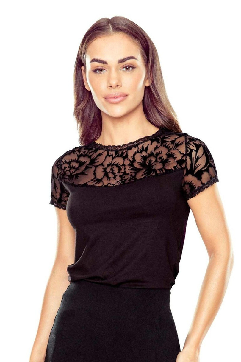Bluzka Toshi z krótkim rękawem to elegancka i kobieca propozycja, która zachwyca subtelnym połączeniem klasyki z dekoracyjnymi detalami. Model został wykonany z miękkiej, elastycznej wiskozy, dzięki czemu doskonale układa się na sylwetce i zapewnia komfort noszenia przez cały dzień. Klasyczny okrągły dekolt zyskuje wyjątkowy charakter dzięki efektownej siateczce z kwiatowym wzorem typu flock, która zdobi zarówno dekolt, jak i krótkie rękawy. Delikatna, półtransparentna struktura siateczki nadaje bluzce lekkości i elegancji, subtelnie eksponując górną część sylwetki. Bluzka Toshi świetnie sprawdzi się w stylizacjach biurowych, na uroczystości rodzinne, kolacje czy wieczorne wyjścia. To uniwersalny model dla kobiet ceniących styl, jakość i ponadczasową elegancję.
