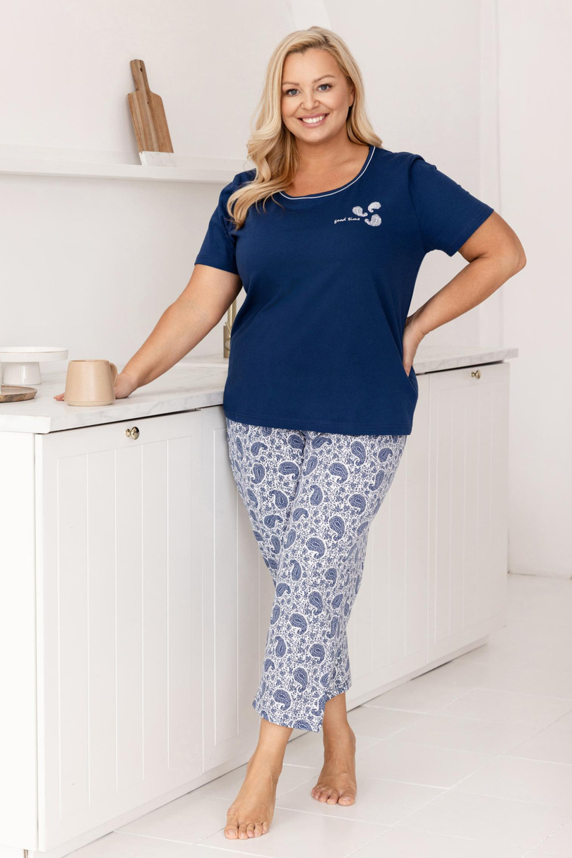Komfortowa piżama damska zaprojektowana z myślą o wygodzie i swobodzie ruchów. Zestaw składa się z jednokolorowej koszulki z krótkim rękawem oraz spodni o długości 3/4 ozdobionych subtelnym wzorem. Delikatna, pastelowa kolorystyka nadaje całości spokojny i kobiecy charakter. Prosty, luźny krój zapewnia komfort noszenia zarówno podczas snu, jak i codziennego wypoczynku w domu. Piżama doskonale sprawdzi się przez cały rok, szczególnie w cieplejsze dni. Skład: 100% Bawełna