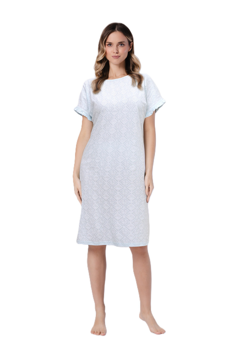 Koszula damska Clea 1730 marki Leveza to lekka, kobieca propozycja idealna na sezon wiosenno-letni. Wykonana w 100% z naturalnej bawełny, zapewnia doskonałą przewiewność, miękkość oraz komfort noszenia przez całą noc. Model z dekoltem w lekką łódkę subtelnie podkreśla linię szyi, a obniżona linia ramion zakończona delikatną falbanką nadaje koszuli romantycznego i swobodnego charakteru. Miętowa kolorystyka w połączeniu z nowoczesnym, nieregularnym geometrycznym wzorem tworzy świeży i modny wygląd. Długość do kolan sprawia, że koszula doskonale sprawdzi się zarówno jako koszula nocna, jak i wygodna odzież domowa.