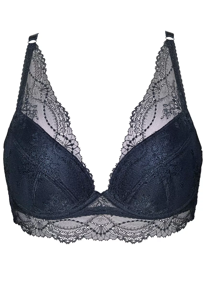 Zupełnie nowa konstrukcja typu plunge z mocno obniżonym środkiem, która subtelnie unosi i zbiera biust, Miski usztywniane, wykonane z pianki gorseciarskiej powleczonej koronką w delikatnie połyskujący kwiatowy wzór, Wewnętrzną część misek pokryto bawełną ze standardem OEKO-TEX®, dzięki czemu są przyjazne dla skóry, Tył biustonosza uszyty z koronki, Pionowe fiszbiny boczne stabilizują obwód biustonosza, Biustonosz zaprojektowano i uszyto w Polsce, W celu utrzymania bielizny w dobrej kondycji przez długi czas zaleca się delikatne pranie ręczne w temperaturze 30°C, Modelka ma 175 cm wzrostu i nosi rozmiar 70F.