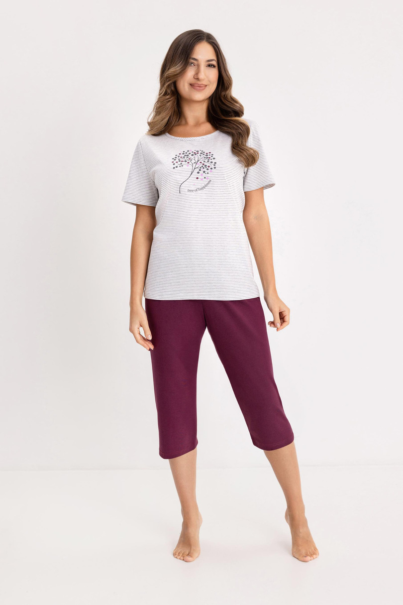 Piżama damska 732 BIG W/26 REGINA to wygodny i stylowy komplet nocny wykonany w 100% z naturalnej bawełny. Oddychający, miękki materiał zapewnia komfort snu oraz przyjemne uczucie na skórze przez całą noc. Koszulka w paski z krótkim rękawem i półokrągłym dekoltem gwarantuje swobodę ruchów, a ozdobny nadruk na przodzie nadaje całości modnego, kobiecego charakteru. Jednolite spodnie o długości 3/4 doskonale uzupełniają zestaw, zapewniając wygodę i lekkość noszenia. To idealna piżama damska do spania oraz domowego relaksu o każdej porze roku.