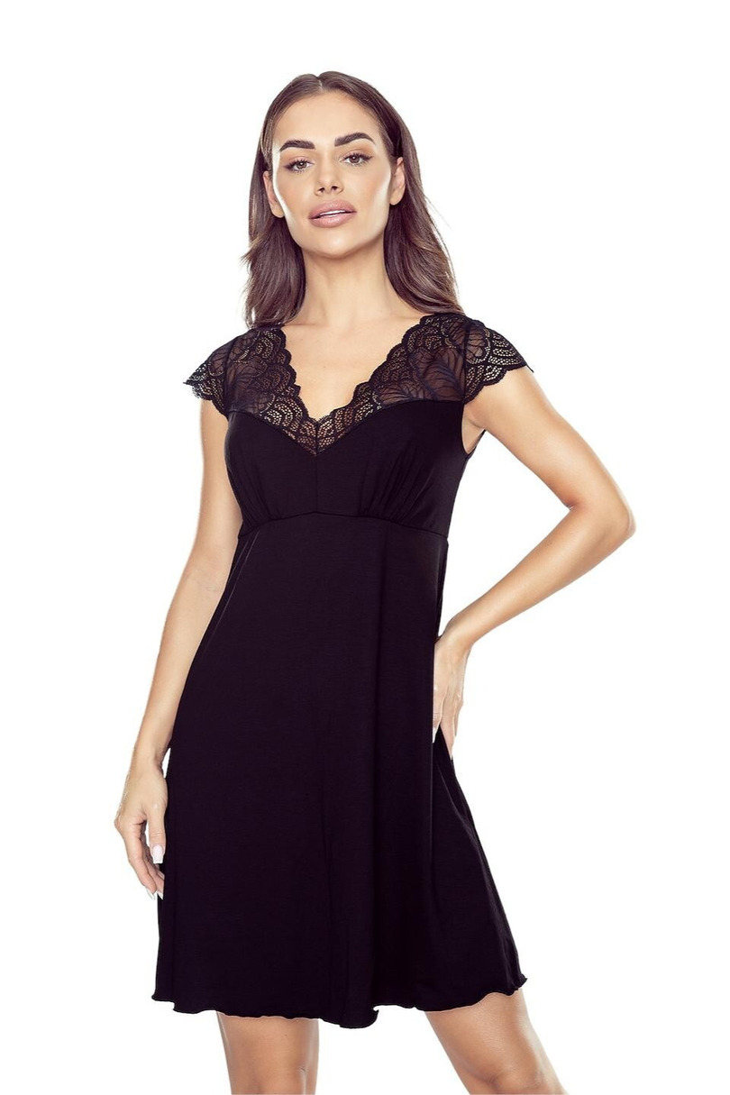 Koszula nocna damska First Lady Britney to połączenie elegancji, kobiecości i wyjątkowego komfortu. Wykonana z wysokiej jakości wiskozy, doskonale dopasowuje się do sylwetki, zapewniając miękkość i przewiewność przez całą noc. Model wyróżnia się subtelnym, koronkowym wykończeniem dekoltu, rękawków oraz pleców, które nadają całości zmysłowego charakteru. Efektowne wycięcie na plecach podkreśla linię ramion i dodaje koszulce wyjątkowej lekkości. Krótki rękaw oraz delikatnie rozkloszowany fason sprawiają, że koszula pięknie układa się na ciele i gwarantuje swobodę ruchów. To idealna propozycja zarówno na co dzień, jak i na wyjątkowe wieczory.