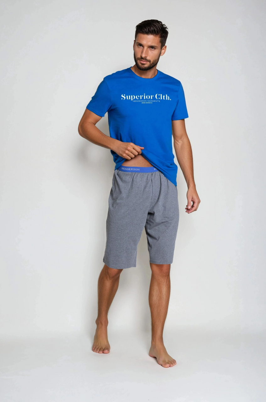 Wygodna, dwuczęściowa piżama męska z nowej kolekcji marki Henderson, w świetnej kolorystyce. Góra w formie wygodnego t-shirtu z nadrukiem, zwraca uwagę swą przyjemną barwą. Spodnie szare, do okolic kolan, z modnym akcentem w postaci drukowanej gumy w pasie. Świetny, sportowy Look, w którym każdy mężczyzna poczuje się komfortowo i swobodnie.