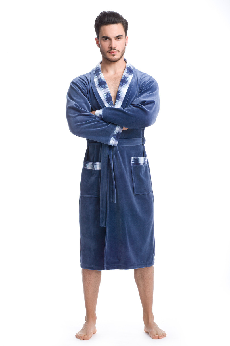Szlafrok męski, welurowy. Eleganckie wykończenia na kołnierzu, mankietach i przy kieszeniach dodają szyku.