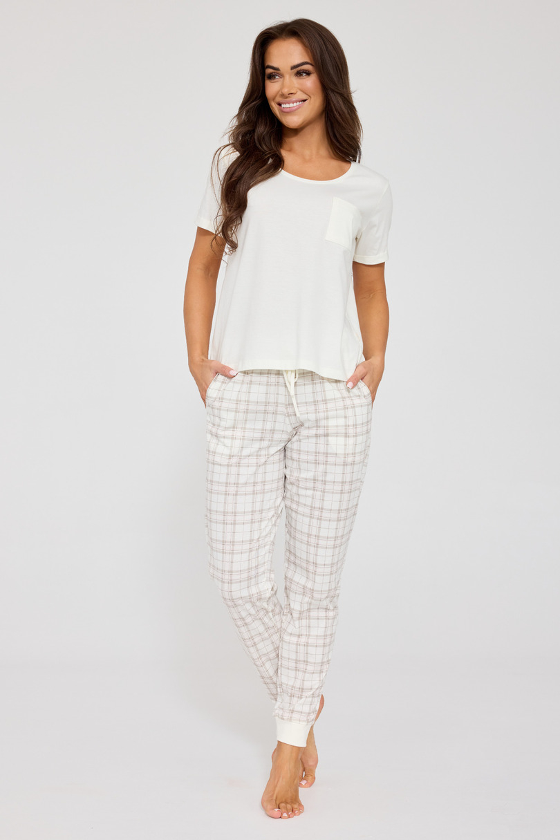Piżama damska KR 730/341 Flow to wygodny i stylowy komplet bielizny nocnej, który łączy klasyczny design z komfortem naturalnej bawełny. Model został wykonany z wysokiej jakości bawełny, dzięki czemu jest miękki, przewiewny i przyjemny dla skóry, zapewniając wygodę podczas snu oraz domowego relaksu. Jednolita koszulka z krótkim rękawem posiada klasyczny okrągły dekolt, który zapewnia wygodne dopasowanie i swobodę ruchów. Na wysokości piersi znajduje się praktyczna naszyta kieszonka, która nadaje całości subtelnego, casualowego charakteru. Komplet uzupełniają długie spodnie w kratkę, które nadają piżamie ponadczasowego stylu. Spodnie posiadają wygodne kieszenie na biodrach, a nogawki zakończone ściągaczami zapewniają dobre dopasowanie i komfort użytkowania. W pasie zastosowano troczek do wiązania, który pozwala na indywidualne dopasowanie do sylwetki. Piżama Flow pakowana jest w eleganckie pudełko, dzięki czemu świetnie sprawdzi się również jako pomysł na prezent.