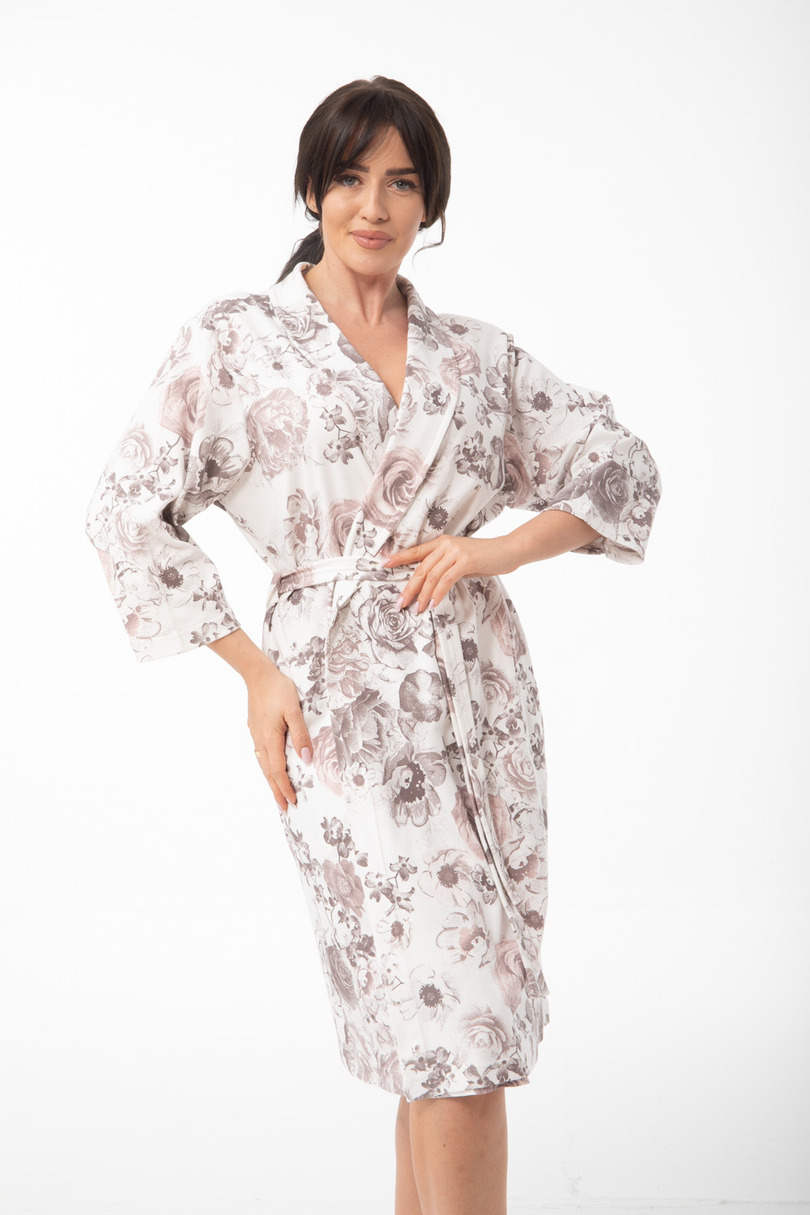 Szlafrok damski uszyty z cienkiej bawełny o kwiatowym wzorze. Wiązany w pasie, na biodrach kieszenie, rękaw o długości 7/8. Skład: 100% bawełna