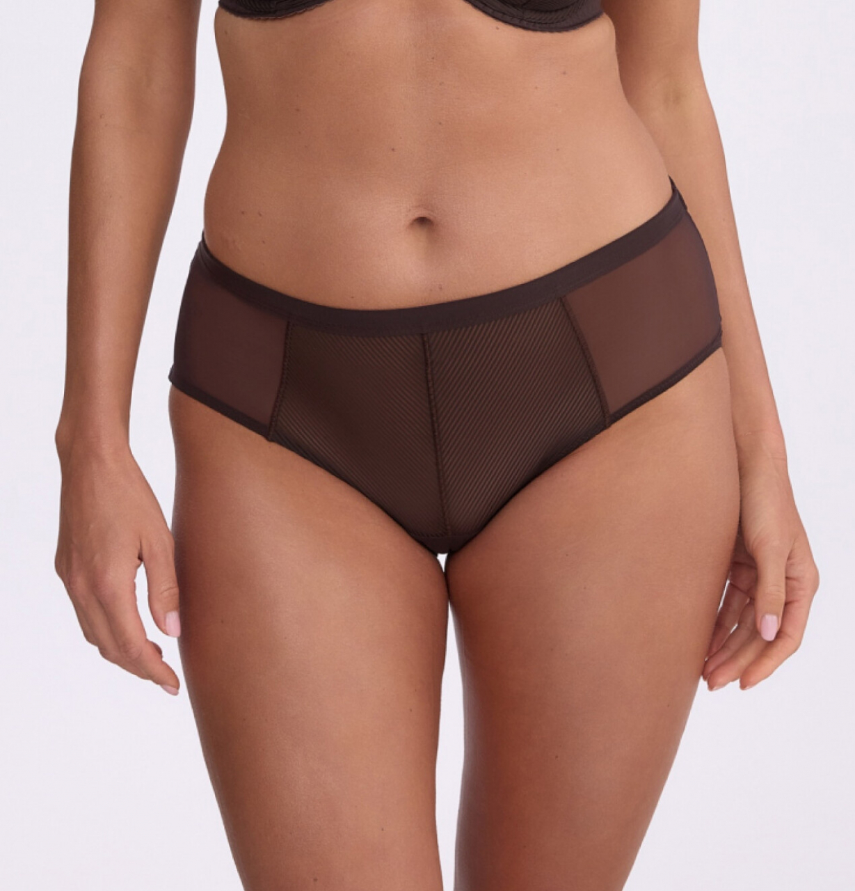 Pełne figi damskie w eleganckim, czekoladowym kolorze to idealne połączenie komfortu i subtelnej kobiecości. Model został zaprojektowany z myślą o codziennym użytkowaniu, oferując wygodę noszenia oraz doskonałe dopasowanie do sylwetki. Klasyczny, pełniejszy krój zapewnia większe krycie i komfort, jednocześnie delikatnie podkreślając kształty. Figi wykonane są z wysokiej jakości materiałów – przód zdobi subtelna, półtransparentna dzianina w pionowe paski, która dodaje lekkości i elegancji. Boki oraz tył z gładkiej, elastycznej tkaniny gwarantują idealne przyleganie do ciała i niewidoczność pod ubraniem. Miękkie wykończenia nie uciskają i nie odznaczają się nawet pod dopasowaną odzieżą. To doskonały wybór dla kobiet, które cenią wygodną, klasyczną bieliznę z nutą nowoczesnego stylu. Figi świetnie komponują się z biustonoszem z tej samej kolekcji, tworząc spójny i elegancki komplet. Skład: 48% Poliamid, 30% poliester, 12% Elastan, 10% Bawełna,