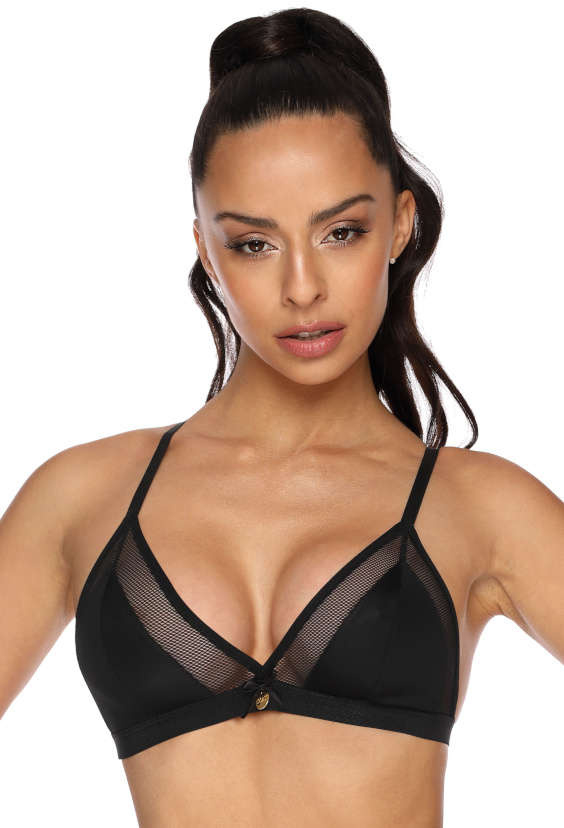 Zmysłowy miękki biustonosz Janet w kolorze czarnym. Model posiada miękkie, trójkątne miseczki, wykonane z gładkiego materiału z dodatkiem siatki. Pod biustem gumka w czarnym kolorze. Model nie posiada fiszbin. Z tyłu zapięcie na haftki. Skład surowcowy: 84% poliamid, 16% elastan