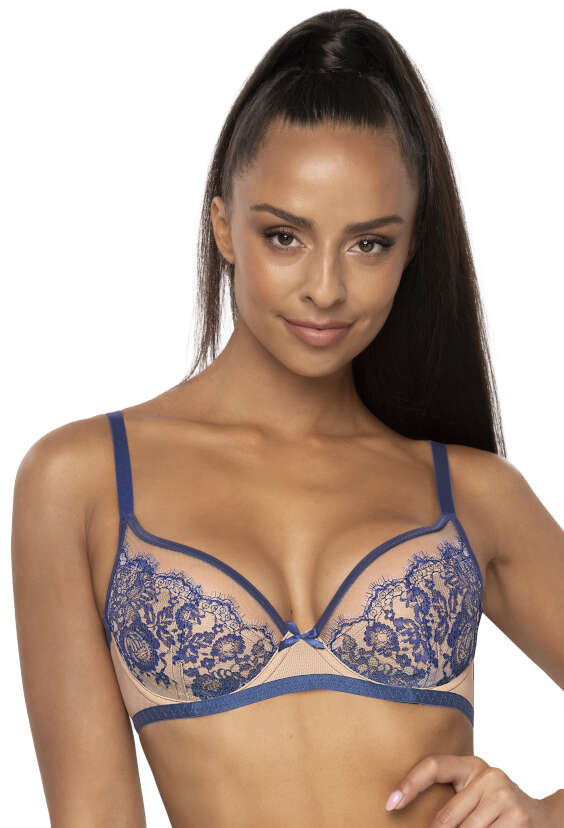 Niebanalny, elegancki miękki biustonosz Frances w kolorze beżowo-granatowym. Miseczki, które idealnie zbierają biust, obszyte granatową koronką. Góra miseczek wykonana z delikatnej siateczki elastycznej, brzeg obszyty miękka bawełnianą taśmą. Tył wykonany z podwójnej elastycznej siateczki. Ramiączka nieodpinane, regulowane. Haftka dwu lub trójrzędowa (w zależności od rozmiaru) z trójstopniową regulacją. Skład surowcowy: 93% poliamid, 7% elastan