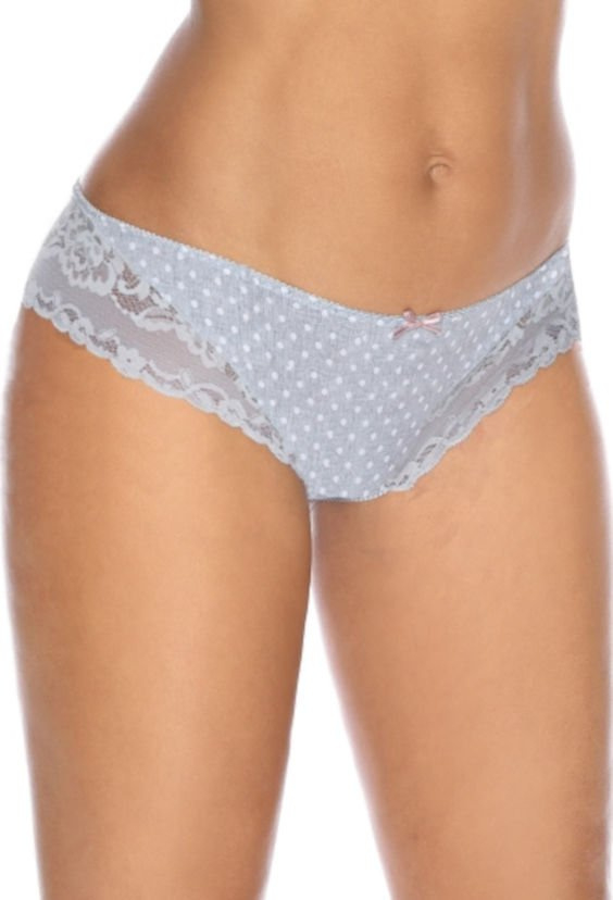 Stringi Vera to finezja i delikatność w jednym. Krój a'la niskie szorty i doskonałe zestawienie osobliwych tkanin w kolorze szarym. Delikatna dzianina w kropeczki na przodzie i tyle string. Zwiewna koronka delikatnie otula pośladki i uda tworząc linie nogawek. Całość tworzy seksowną bieliznę w której każda kobieta poczuje się wyjątkowo.   Skład surowcowy: 28% poliester, 49% poliamid,15% elastan, 8% bawełna