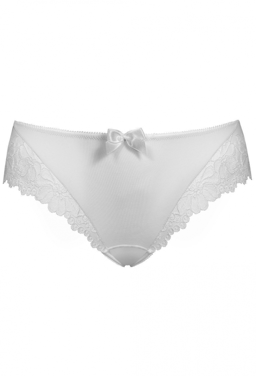 Klasyczne figi damskie o lekko zabudowanym kroju. Przód gładki, na środki zdobiony delikatną kokardką. Nogawki i tył wykonane z koronki. Klinek bawełniany.   Skład surowcowy: 85% poliamid, 12% elastan, 5% bawełna