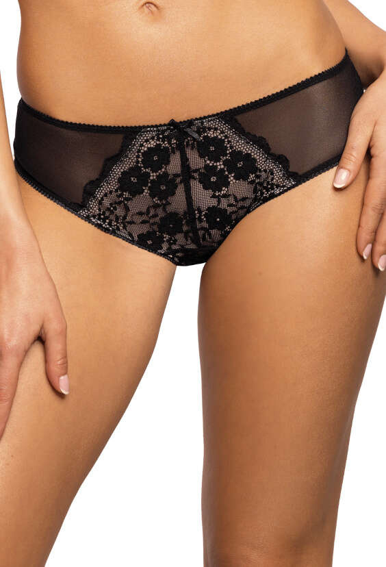 Zjawiskowe figi Niki stworzone z myślą o Paniach ceniących sobie komfort i elegancję noszonej bielizny. Figi  wykonane z ażurowej koronki i siateczki elastycznej. Klinek bawełniany. Skład surowcowy: 81% poliamid, 14% elastan, 5% bawełna.