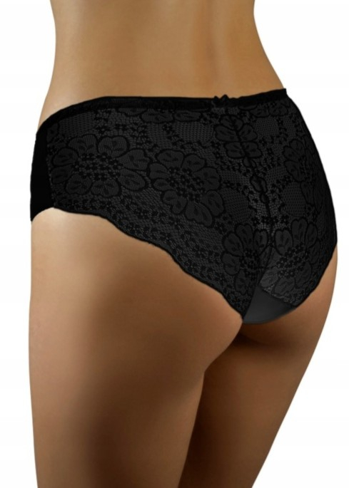 Figi damskie o klasycznym kroju, idealnie dopasowane do ciała. Przód gładki wykonany z miłej w dotyku tkaniny, delikatny koronkowy tył. Bezszwowe wykończenie brzegów. Skład:80% poliamid 20% elastan.