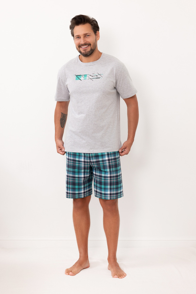 Piżama męska Regina 6001 L/26 to idealne połączenie wygody, funkcjonalności i ponadczasowego stylu. Wykonana w 100% z wysokiej jakości bawełny, zapewnia doskonałą przewiewność oraz komfort noszenia zarówno w cieplejsze, jak i chłodniejsze noce. Koszulka z krótkim rękawem w stonowanym beżowym kolorze została uzupełniona subtelnym nadrukiem na piersi oraz kontrastowym wykończeniem przy dekolcie, co nadaje całości nowoczesnego charakteru. Szorty w klasyczną kratę świetnie komponują się z górą, tworząc spójny i stylowy zestaw. Elastyczny pas zapewnia idealne dopasowanie do sylwetki bez uczucia ucisku. Model dostępny w trzech różnych wariantach kolorystycznych, dzięki czemu każdy mężczyzna może wybrać wersję najlepiej dopasowaną do swojego stylu. To doskonały wybór zarówno do snu, jak i relaksu w domowym zaciszu. Skład: 100% Bawełna