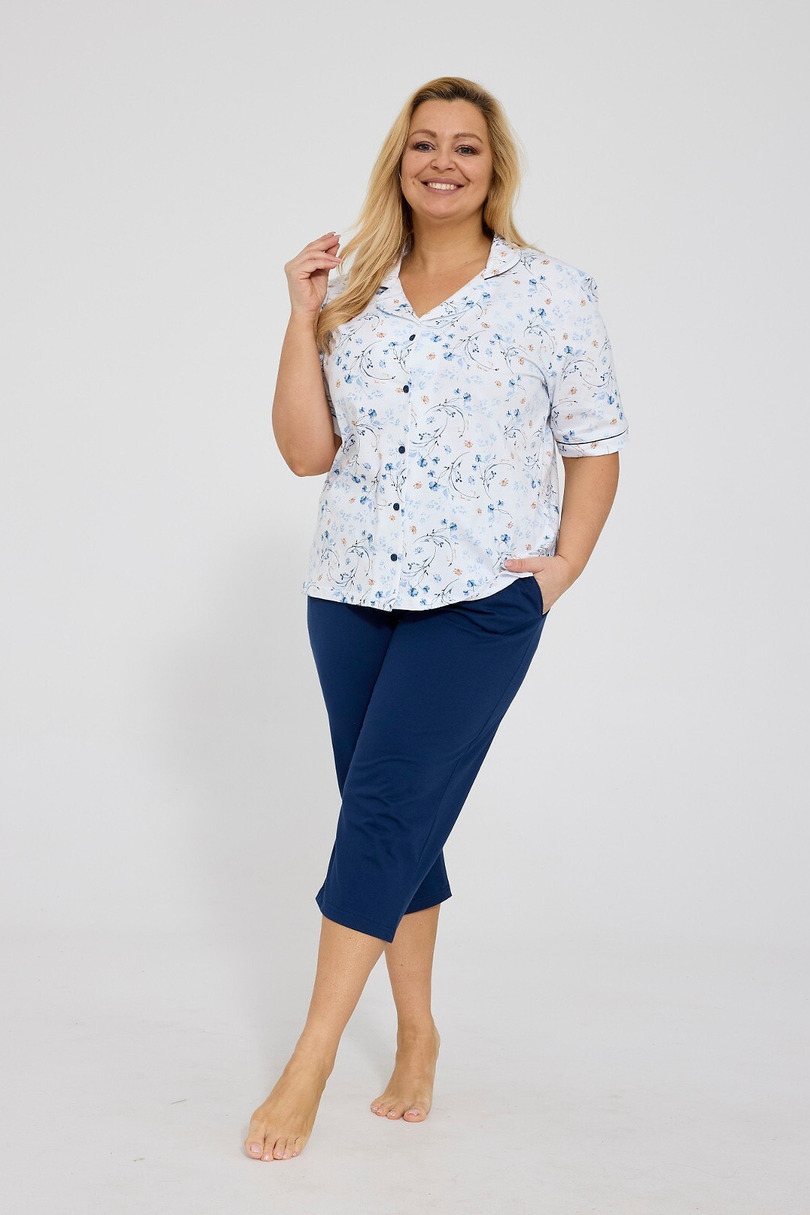 Piżama damska Cornette Yvonne KR 347/347 to idealne połączenie klasycznej elegancji i codziennego komfortu. Wykonana w 100% z wysokiej jakości bawełny, zapewnia doskonałą przewiewność oraz przyjemność noszenia przez cały rok. Górna część zestawu to koszulka z krótkim rękawem, ozdobiona subtelnym, kolorowym printem w kwiaty. Model z kołnierzykiem oraz zapięciem na guziki nadaje piżamie elegancki, ponadczasowy charakter, a jednocześnie zapewnia wygodę użytkowania. Jednolite spodnie o długości 3/4 doskonale uzupełniają całość, gwarantując swobodę ruchów i komfort podczas snu. Elastyczna gumka w pasie, obszyta miękką bawełną, nie uciska i idealnie dopasowuje się do sylwetki. To doskonała propozycja dla kobiet, które cenią naturalne materiały, wygodę oraz stylowy wygląd nawet w domowym zaciszu. Piżama Cornette sprawdzi się również jako praktyczny i elegancki prezent. Skład: 100% Bawełna