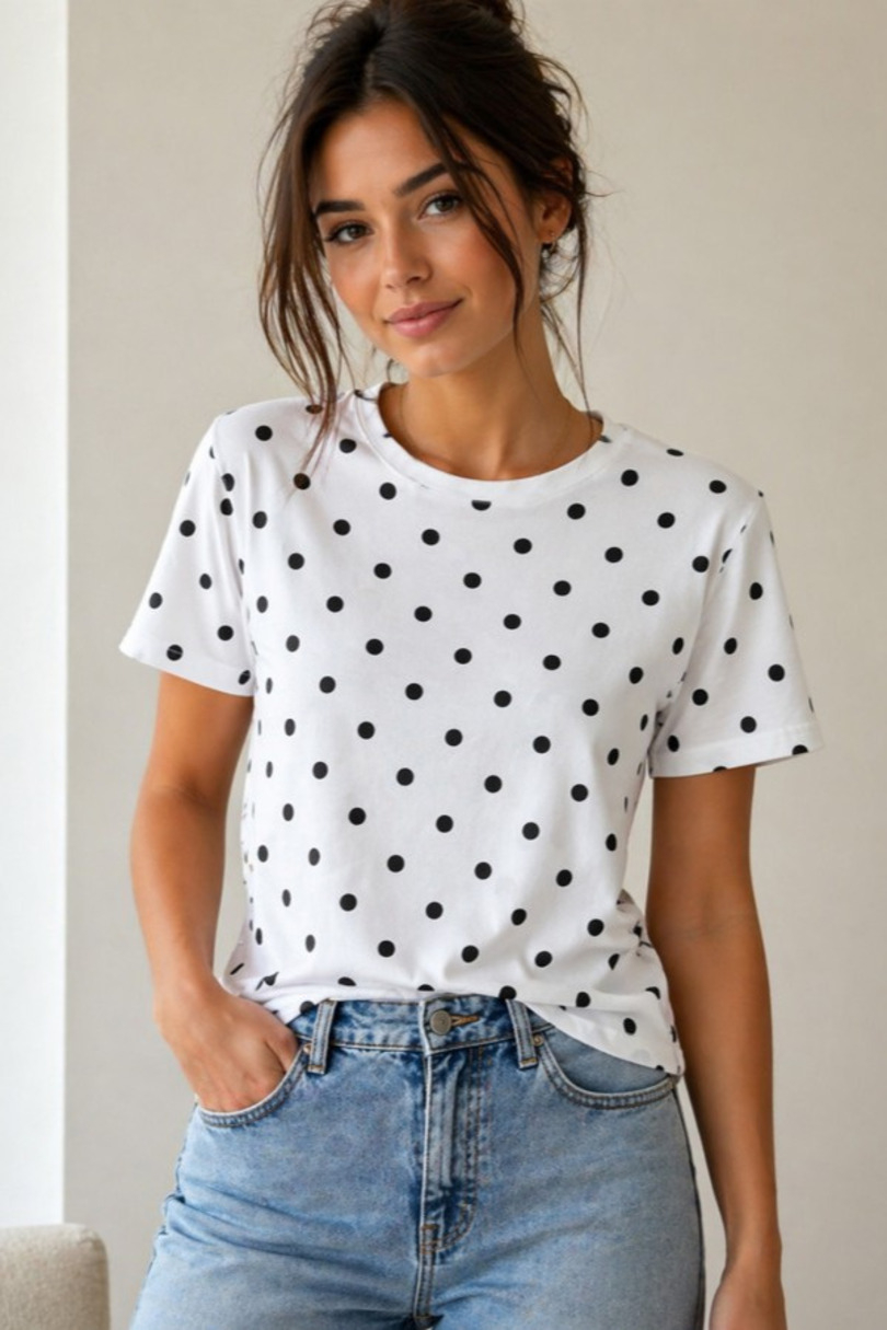 Klasyczna koszulka damska w kropki to idealna propozycja dla kobiet ceniących wygodę i ponadczasowy styl. Model o prostym fasonie z krótkim rękawem i okrągłym dekoltem doskonale układa się na sylwetce, zapewniając komfort noszenia przez cały dzień. Wzór w subtelne, kropki dodaje lekkości oraz dziewczęcego uroku, dzięki czemu koszulka świetnie wpisuje się w casualowe stylizacje. Wykonana z miękkiego, przyjemnego w dotyku materiału, sprawdzi się zarówno na co dzień, jak i podczas spotkań ze znajomymi. Doskonale komponuje się z jeansami, szortami czy spódnicą.