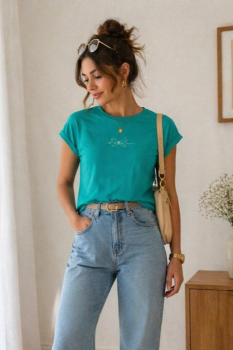 Stylowa i ponadczasowa bluzka damska to idealna propozycja dla kobiet ceniących wygodę i modny wygląd na co dzień. Wykonana z miękkiej, przyjemnej w dotyku dzianiny, zapewnia komfort noszenia przez cały dzień. Klasyczny, prosty krój sprawia, że bluzka doskonale dopasowuje się do sylwetki i pasuje do wielu stylizacji. Krótki rękaw z modnym wywinięciem dodaje jej nowoczesnego charakteru, a subtelny, minimalistyczny nadruk z delikatnymi dżetami nadaje całości eleganckiego akcentu. Dół wykończony na prosto umożliwia noszenie zarówno wpuszczonej w spodnie, jak i luźno. To uniwersalny element garderoby, który sprawdzi się zarówno w casualowych, jak i bardziej eleganckich zestawach.