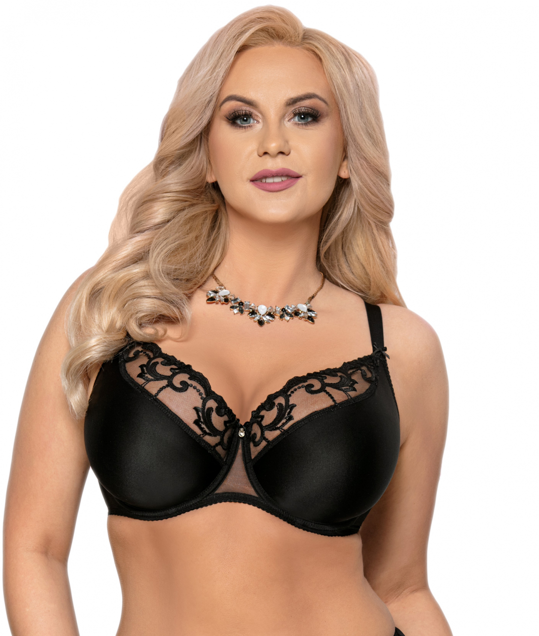 Półusztywniany biustonosz, bez fiszbiny bocznej wykonany na nowej konstrukcji K16. Część usztywnioną miseczki sięgająca powyżej linii brodawki sutkowej, wykonany z miski formowanej termicznie. Biustonosz bez szwa na misce, na górnej części miski znajduje się przepiękny haft, obwód biustonosza wykonany z tiulu. Na ramiączkach subtelne kokardki, na środku między miskami biżuteryjna ozdoba, ramiączka nieodpinane.