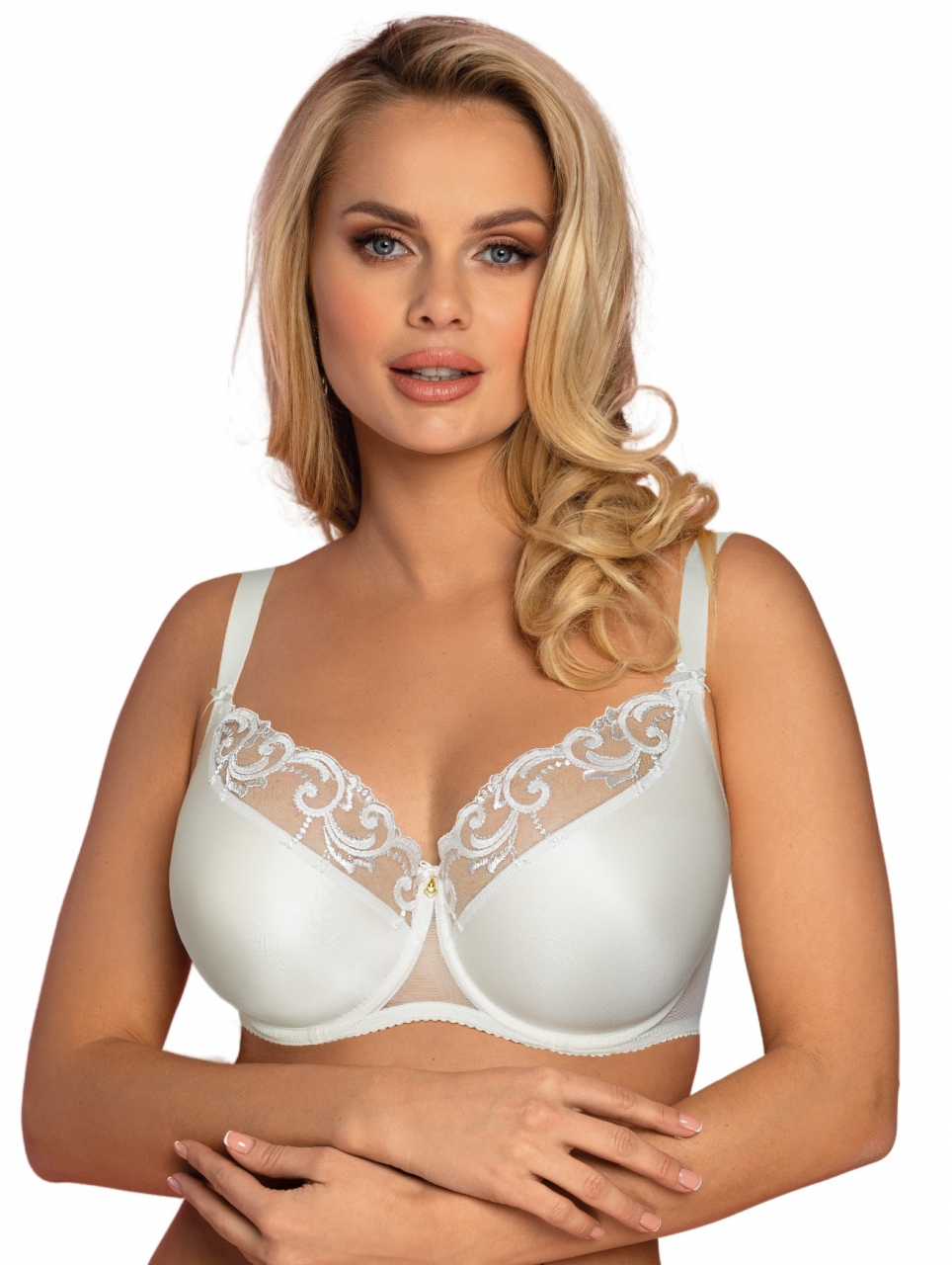 Półusztywniany biustonosz, bez fiszbiny bocznej wykonany na nowej konstrukcji K16. Część usztywnioną miseczki sięgająca powyżej linii brodawki sutkowej, wykonany z miski formowanej termicznie. Biustonosz bez szwa na misce, na górnej części miski znajduje się przepiękny haft, obwód biustonosza wykonany z tiulu. Na ramiączkach subtelne kokardki, na środku między miskami biżuteryjna ozdoba, ramiączka nieodpinane.