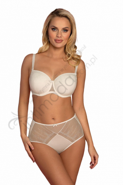 Biustonosz typu full cup, nowość w kolekcji bazowej, od polskiego producenta bielizny Vena Lingerie. Miski biustonosza zostały wykonane z pianki pokrytej delikatną dzianiną. Konstrukcja biustonosza, to K17. Ozdobiony został haftem, który znajduje się na górnej części miseczek oraz na mostku. Geometryczne wzory dodają modelowi swoistej lekkości, którą z pewnością docenisz przy bliższym poznaniu tego modelu. Jest to propozycja do wiosenno-letnich stylizacji, kiedy potrzebujesz jasnej bielizny, aby wyeksponować kreację. Biustonosz zaprojektowany i uszyty w Polsce przez firmę VENA, z użyciem najwyższej jakości materiałów renomowanych producentów europejskich.